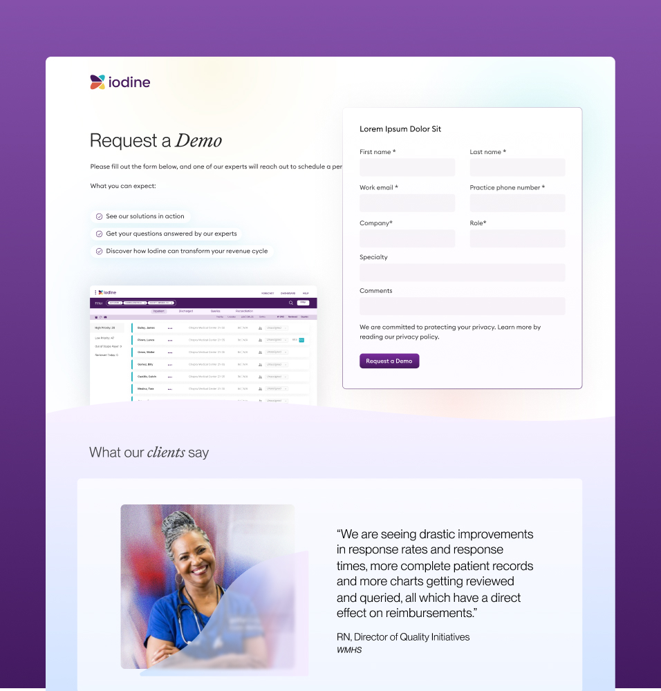 As a pioneer in AI-powered Clinical Documentation Integrity and mid-revenue cycle solutions, Iodine Software had a proven track record of transforming how health systems capture, interpret, and act on clinical data. Iodine needed more than a visual update. They needed a refreshed identity and digital platform that could reclaim their position as the trusted leader in clinical AI, tell a distinct story that stood apart from the crowd, and set the stage for the next phase of growth.